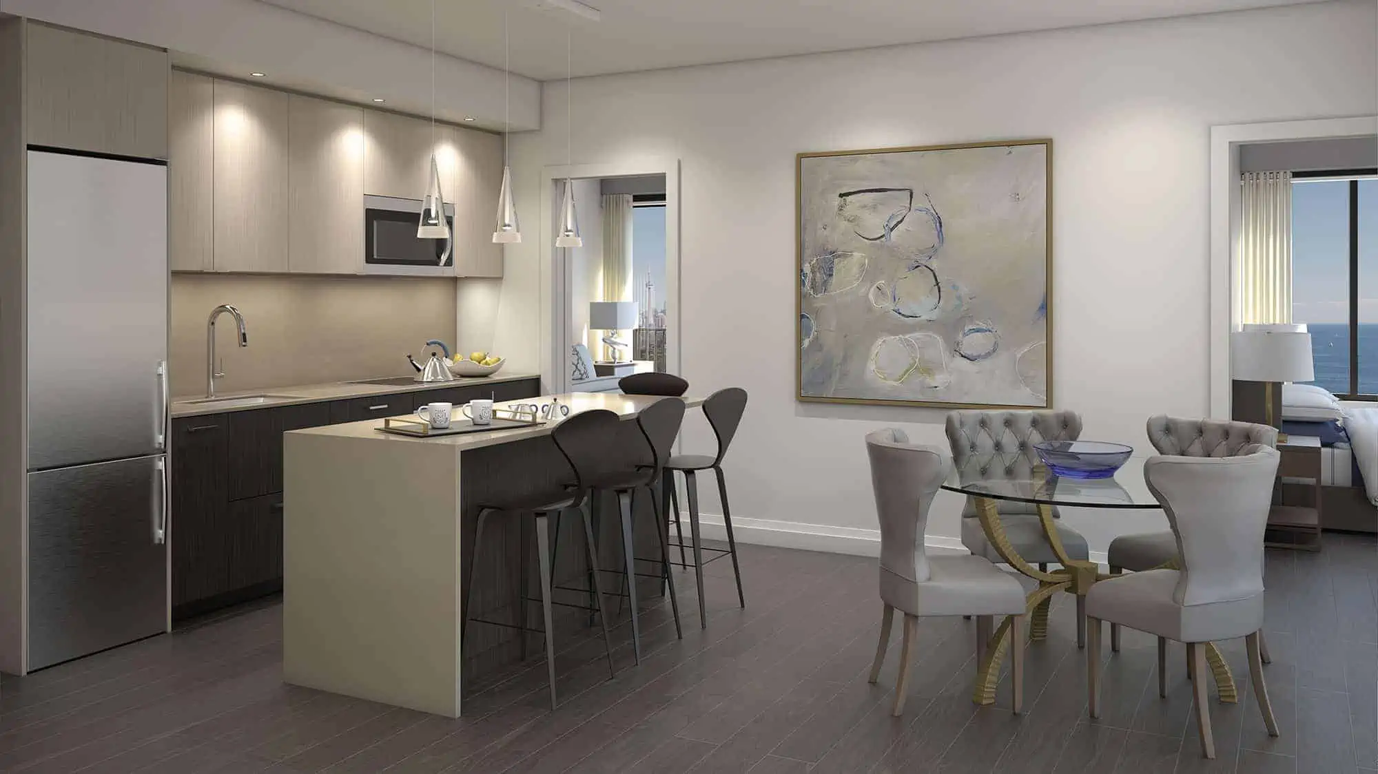 Features: Suite A with 9-foot ceiling has 1 Bed plus Den, 2 baths and is approximately 687 square feet, includes laminate and ceramic tile flooring throughout, laundry in the unit, designer cabinets with quartz counter top and under cabinet lightning and stainless steel appliances (refrigerator, dishwasher, cooktop, oven and over the range microwave oven, private terrace or outdoor space, parking